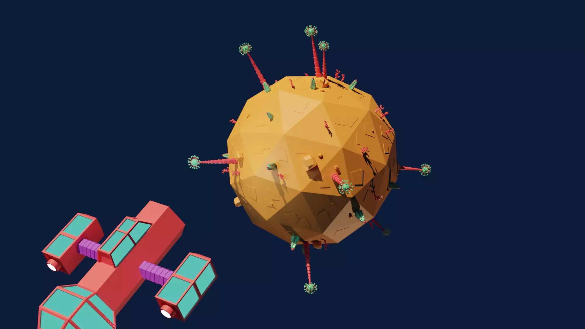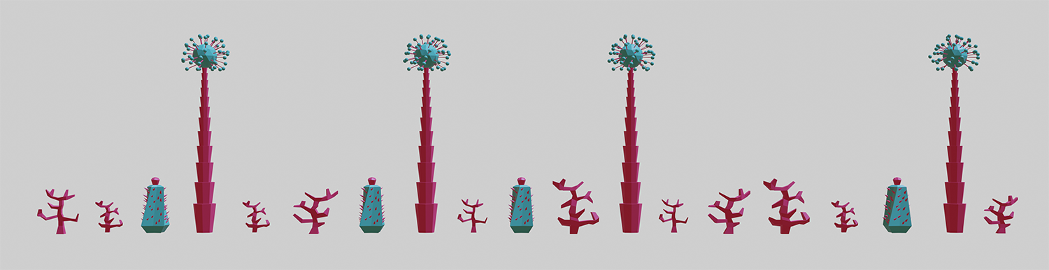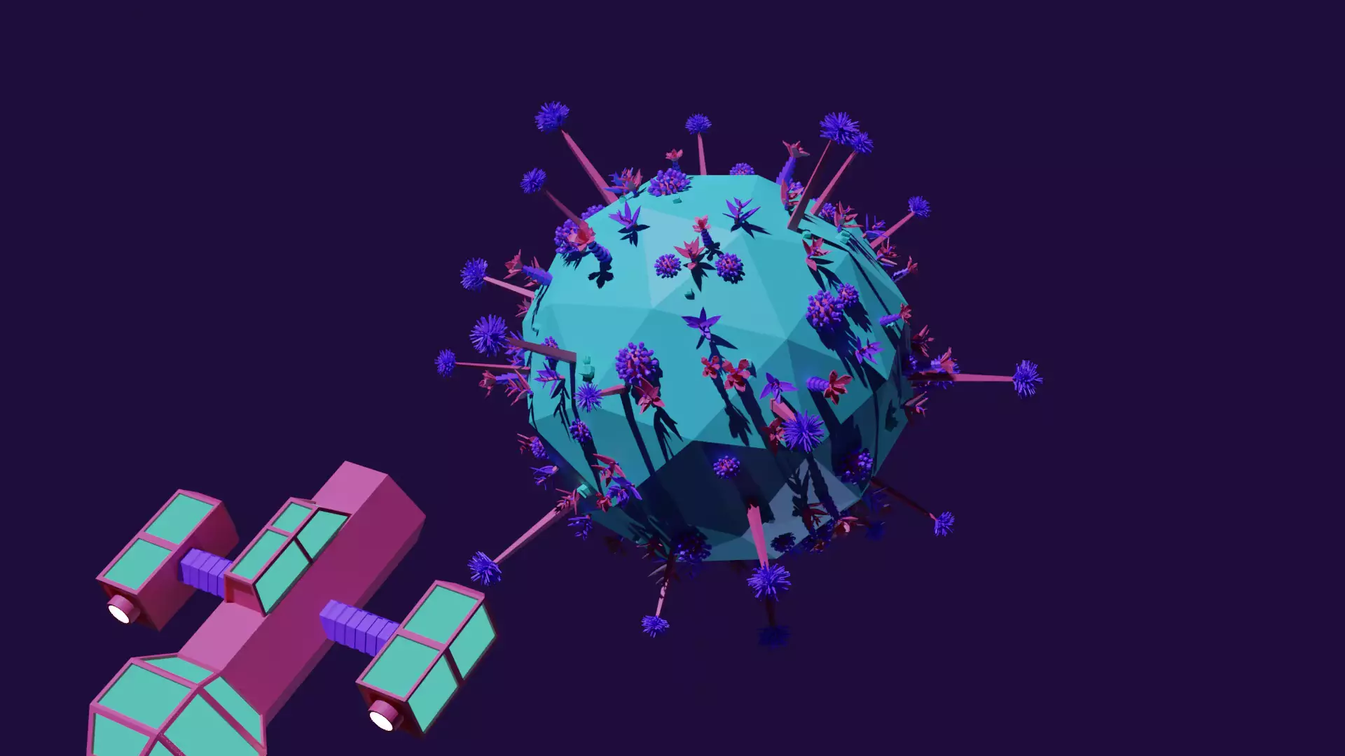 In my project I've created three biomes in Blender: a desert, a jungle and a poisoned one. Each biomes have their own planet. The last 3D environment is the interior of the botanist's spaceship, where the collected plants are stored.